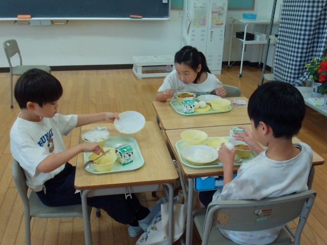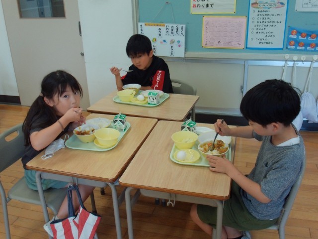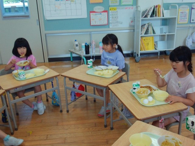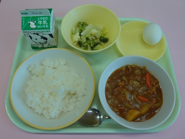 今日は、子供たちに大人気のカレーライスです。おかわりをして、もりもり食べていました。ゆで卵の殻も上手にむいて食べました。