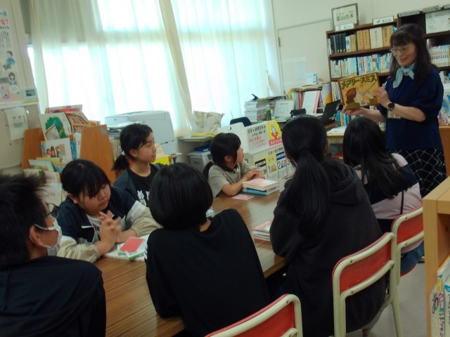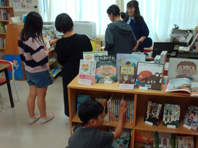 今日は、高学年の図書館司書に読み聞かせの時間でした。終わった後、気に入った本を借りていました。