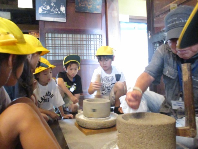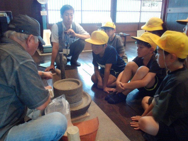 午後からは、民俗民芸村へ行きました。古い道具や富山の薬についてお話を聞いたり展示物を見学したりしました。石臼体験もさせていただきました。今日の学びを、これからの社会の学習にいかしていきましょう。