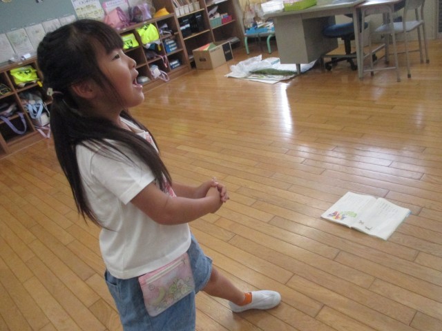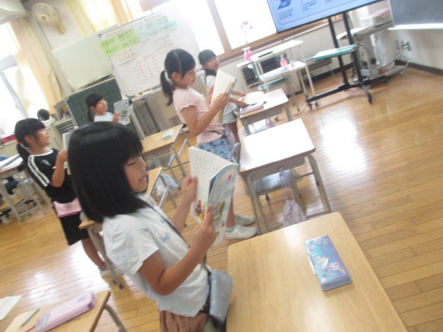 国語では、「おおきな かぶ」の学習をしています。「うんとこしょ、どっこいしょ。」と、みんなで声をそろえて音読をがんばっています。実際にかぶをひっぱっているような動作で音読する子もいました。