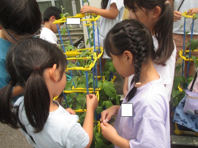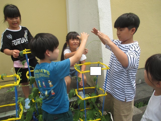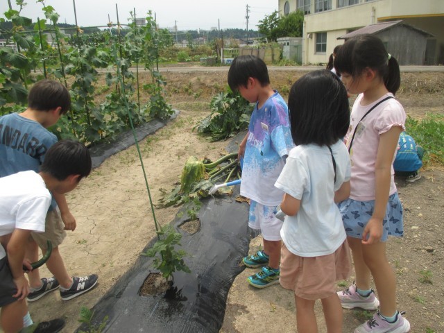 1年生はあさがお、2年生は野菜を育てています。育てている植物の最近のニュースを伝え合った後、お互いの学年の鉢や畑へ行きました。2年生は1年生に去年の経験を生かしてアドバイスをしていました。畑では、育った野菜を紹介する2年生と、たくさんの葉や実に驚く1年生でした。
