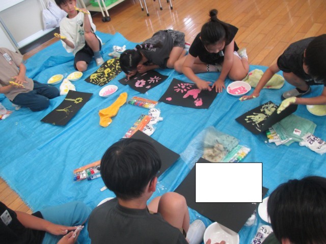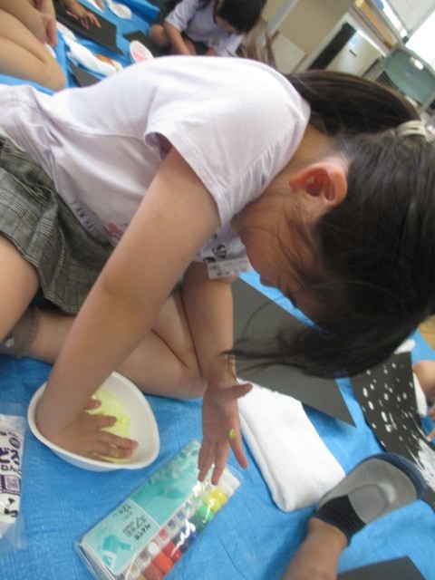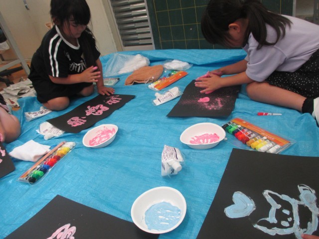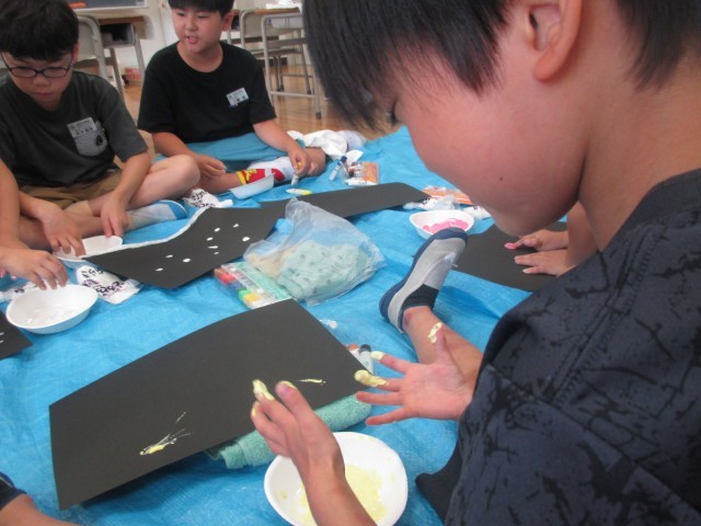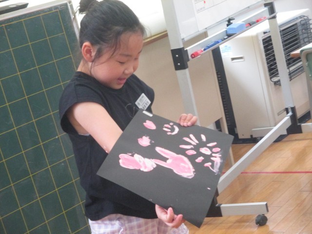 図工では「とろとろえのぐで」という液体粘土を使った学習をしています。液体粘土の感触を楽しみながら、どんな表現方法があるか考えながら試していました。「手を全部使ってスタンプみたいにしたよ」「字や絵をかいたよ」と楽しそうに話す子供たちでした。