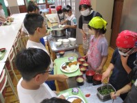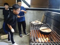 4、5、6年生、宿泊学習2日目。野外炊飯でカレーライスを作ります。 薪をかまど...