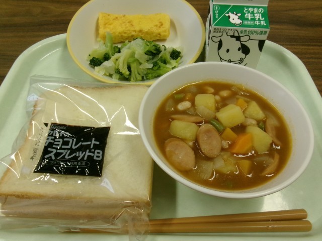 今日の献立は、食パン、牛乳、卵ロール、フレンチサラダ、ミネストローネ、チョコレートクリームです。