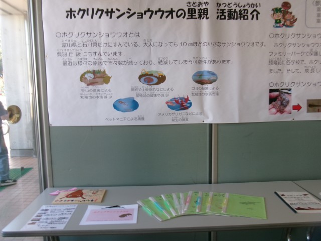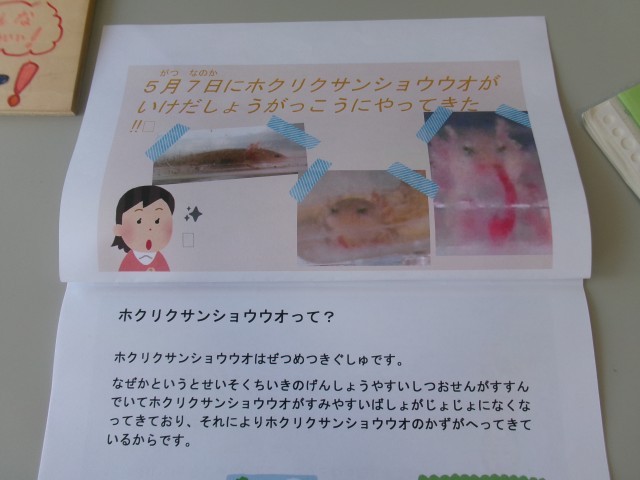 5年生の子供たちの「ホクリクサンショウウオ飼育記録」が展示され、多くの方が手に取っていました。