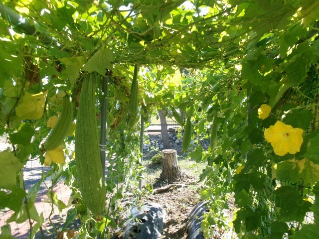 たくさん実ったヘチマの実を、切って塩でもみました。