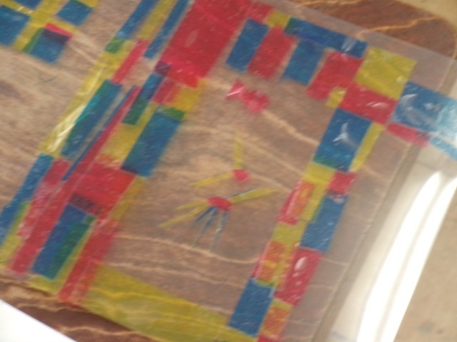 窓の外の景色を写しながら、自分がイメージするものをステンドシールで貼っていきます。