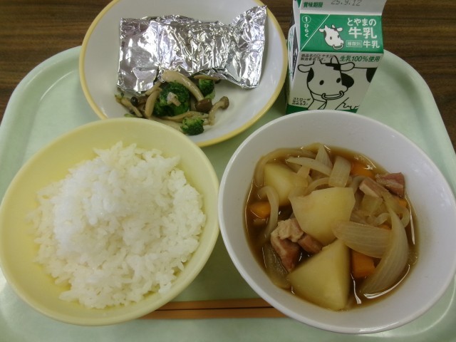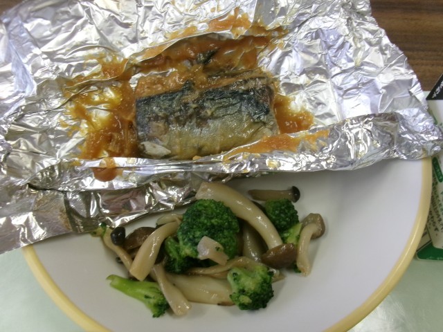 今日の献立は、ごはん、牛乳、さばの銀紙焼き、ブロッコリーときのこのソテー、ベーコンとじゃがいもの煮物です。