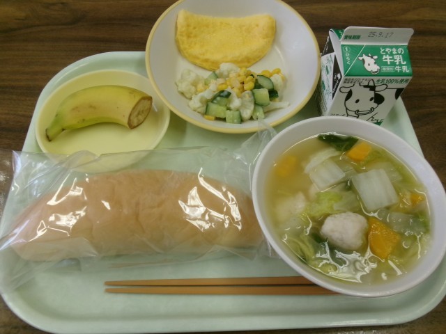 今日の献立は、コッペパン、牛乳、チーズオムレツ、カラフルサラダ、野菜のスープ煮、バナナです。