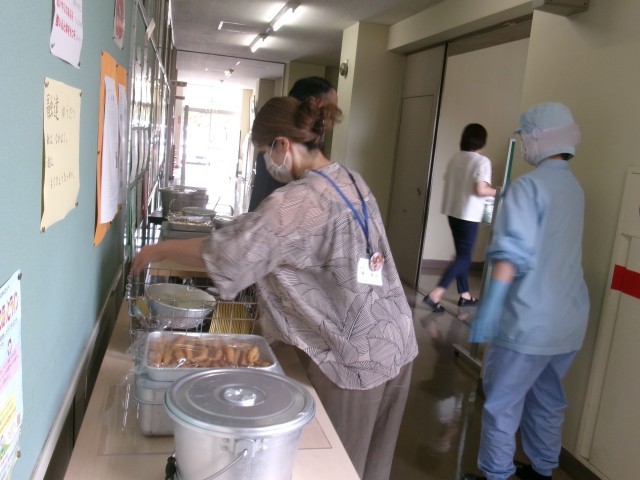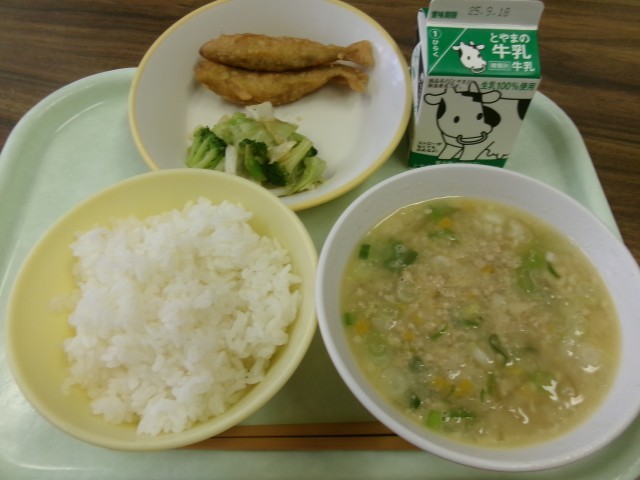 今日の献立は、ごはん、牛乳、わかさぎのフリッター、ブロッコリーの和え物、坦々春雨スープです。