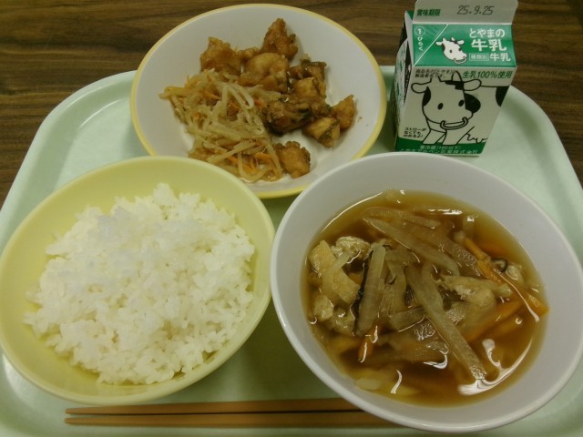 今日の献立は、ごはん、牛乳、鶏肉のねぎソースかけ、もやしのナムル、沢煮椀です。