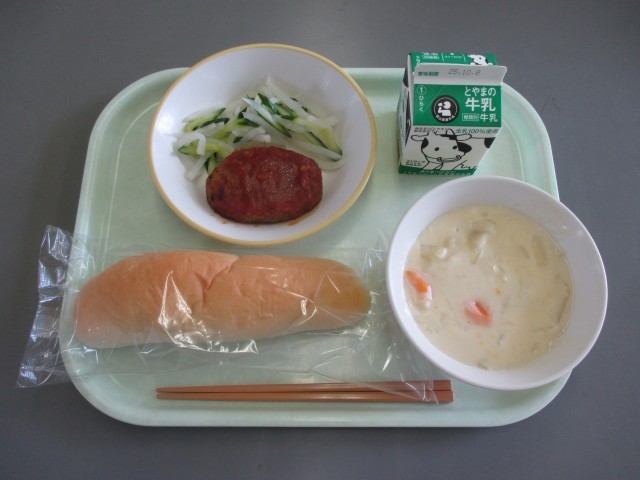 今日の献立は、コッペパン、牛乳、ハンバーグのケチャップかけ、だいこんサラダ、クリームスープです。