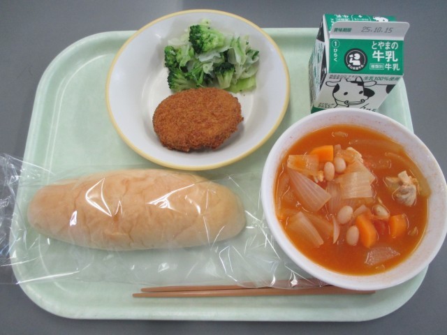 今日の献立は、コッペパン、牛乳、かぼちゃコロッケ、そえ野菜、豆と鶏肉のトマト煮です。