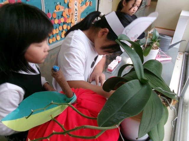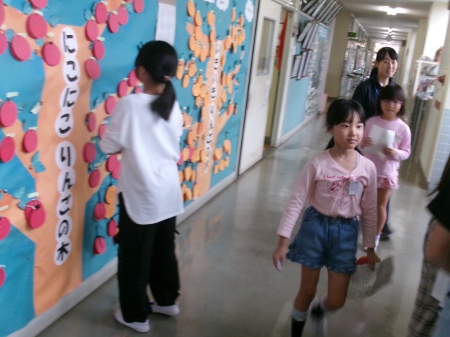 友達のよいところや自分のがんばりを書く「りんごの実」。