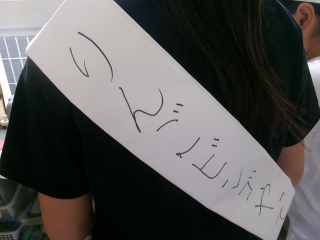 手作りのお面やたすきを身につけ、がんばった友達を迎えます。