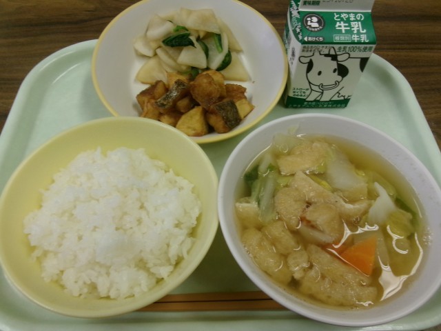 今日の給食は、ごはん、牛乳、ホキとじゃがいもの甘からめ、かぶの色どり、みそ汁です。