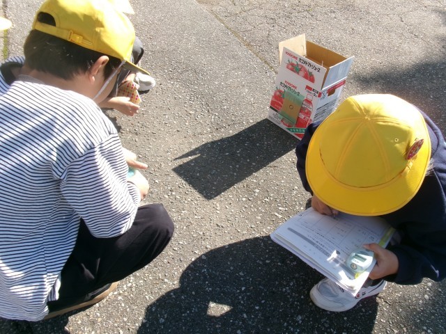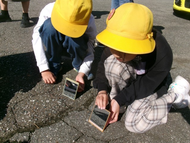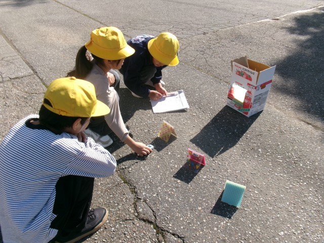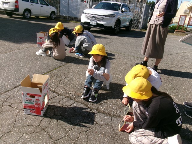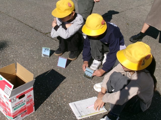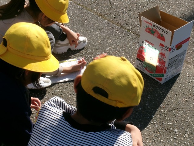 「鏡ではね返した日光が当たったところはあたたかくなるか」の実験をしています。