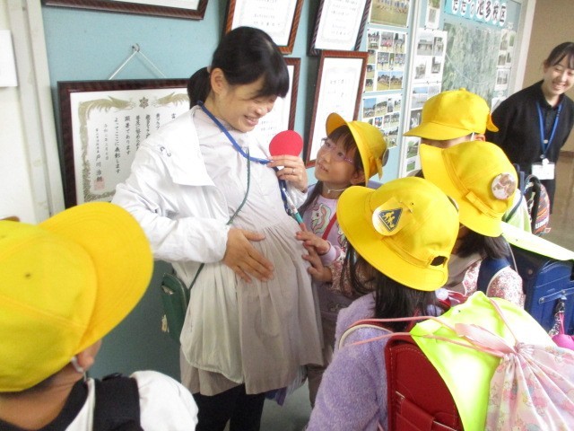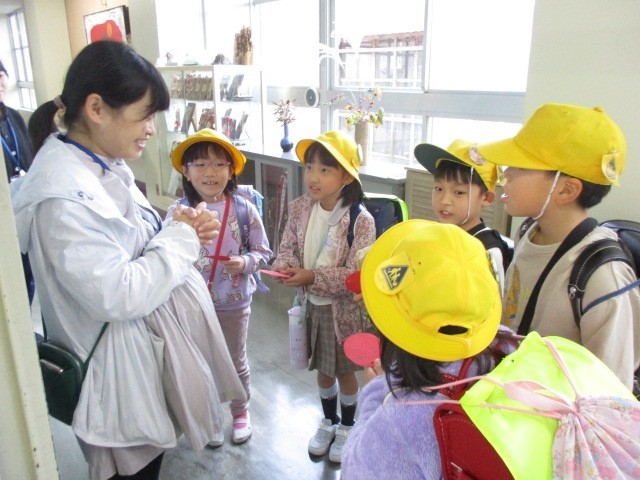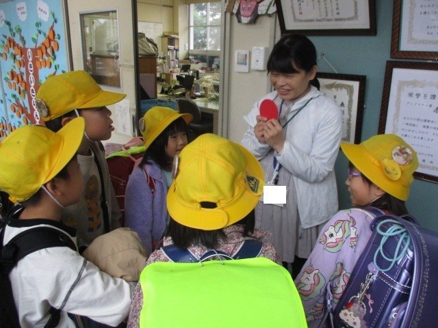 1・2年生が、お世話になった養護教諭の先生に、ありがとうの気持ちを書いたリンゴの実をプレゼントしました。