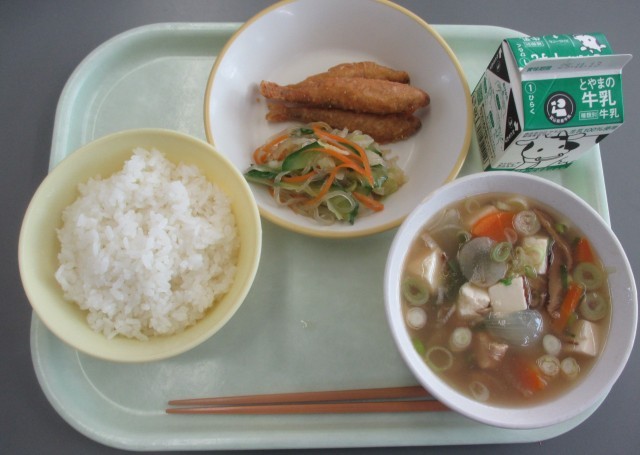 給食では、「もち米」の代わりに「もち麦」が入っており、鶏肉や大根、ごぼう、玉ねぎなどの野菜もたっぷりで食べごたえのあるスープでした。
