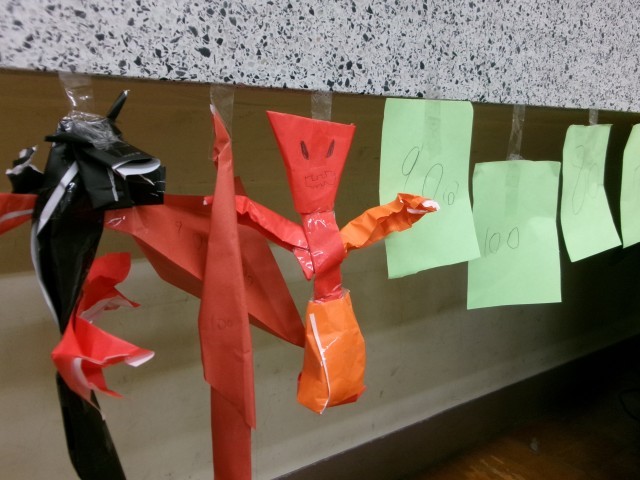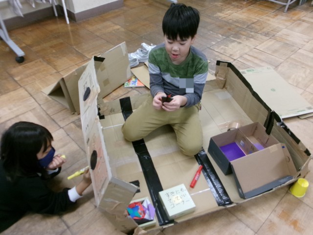 段ボールや牛乳パックなどの材料を使って、おもちゃ作りをしました。