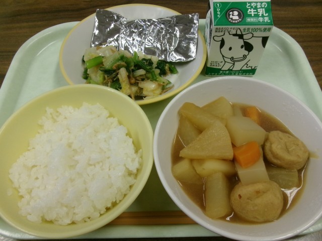 今日の献立は、ごはん、牛乳、さばの銀紙焼き、えのきのごま和え、関東だきです。