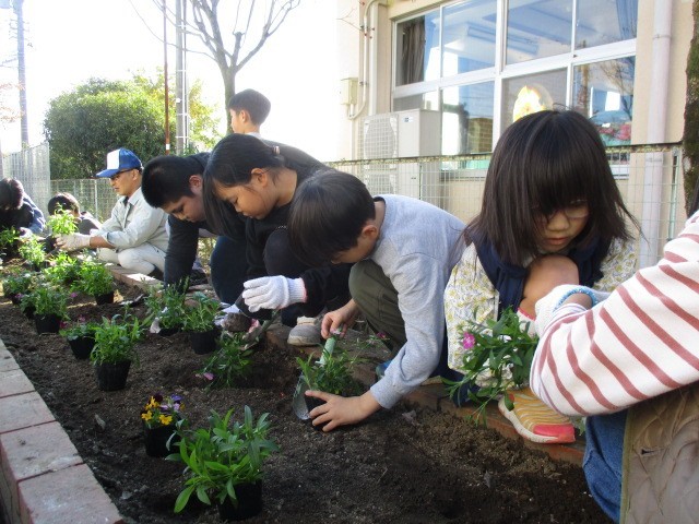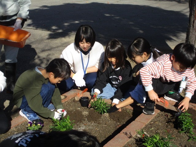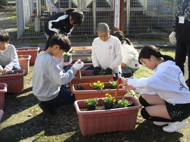 わくわくタイムに、ファミリー班のみんなで花の苗を植え付けました。