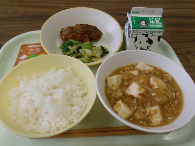 今日の献立は、ごはん、牛乳、ホキの竜田揚げ、チンゲンサイひたし、厚揚げのそぼろ煮、大豆ふりかけです。