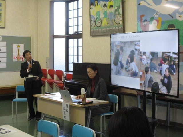 講演の中で、特色ある本校の取組(ファミリー学習、サークルトーク等)について説明させていただきました。