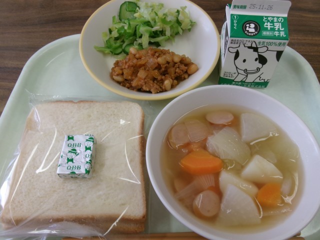 他には、牛乳、ポケットチーズ、そえ野菜、野菜のスープ煮が出ました。