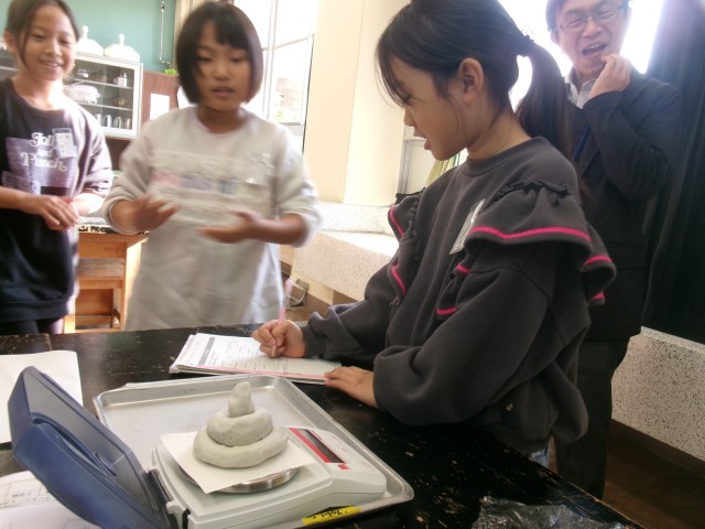 粘土でいろいろな形を作っていますが、一つ一つ電子天秤で重さを量り、形によって重さが変わるかどうかを調べる学習です。