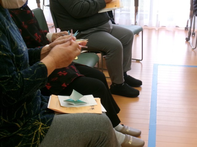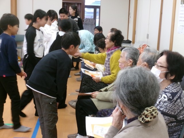 手紙やパンフレット、折り紙等を渡したり、クイズを出したり、子供たちは一生懸命お年寄りを元気づけようとしました。