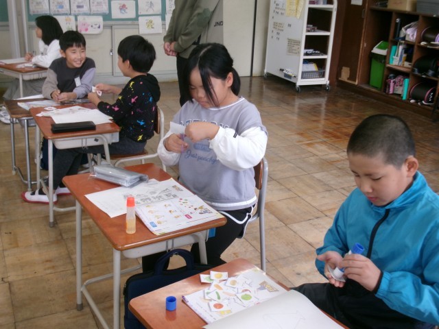 3年生は色や形さがし、4年生は欲しい果物や数を伝えながらフルーツをもらいフルーツパフェを作っていました(紙のパフェです)。