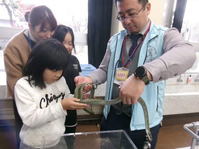 ヘビやカメなど、持参していただいた生き物を怖がりながら見ていた子供たちでしたが、次第に慣れて触れるようになりました。