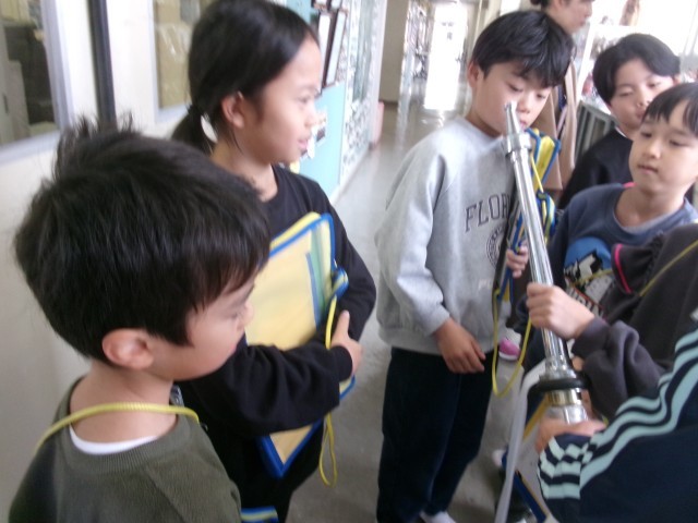 職員室の火災報知器、消火栓、消火器などを確認しています。