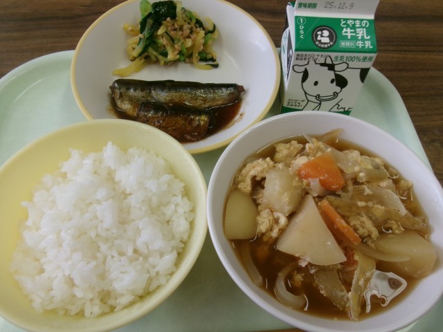 今日の献立は、ごはん、牛乳、いわしの土佐煮、納豆和え、卵とじです。