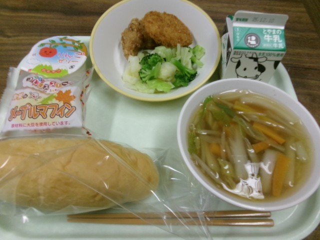 コッペパン、牛乳、春雨スープ、そえ野菜は共通です。