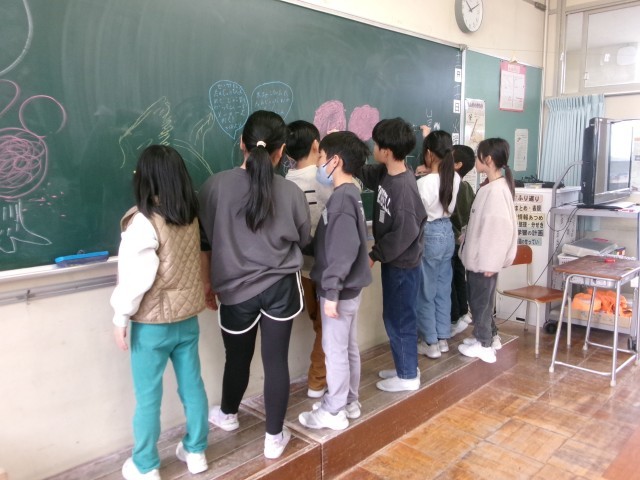 長休みに3・4年生の教室に行くと、仲良く黒板に絵を描いていました。