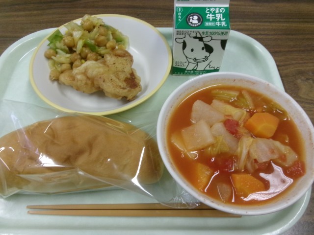 今日の献立は、コッペパン、牛乳、ポークフリッター、ひよこ豆のサラダ、野菜のトマトスープ煮です。