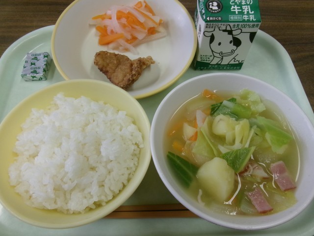 今日の献立は、ごはん、牛乳、豚肉の香り揚げ、ピクルス、野菜のスープ煮、ポケットチーズです。