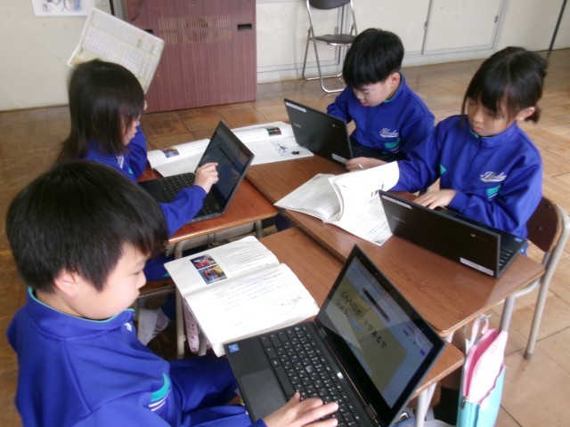 2年生は、今日初めて読んだ説明文「ロボット」の特徴を入力していました。