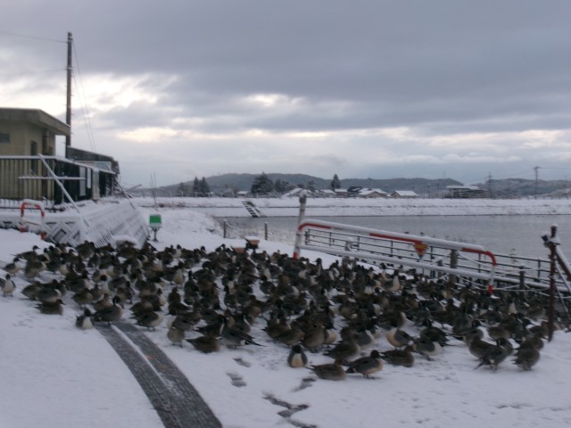 えさをもらえると勘違いしたカモが群れになって近寄ってきました。