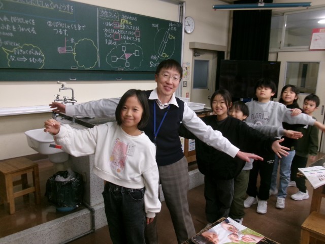 真ん中の写真は「人を何人かはさんだら磁石の指す向きは変わるか」という実験です。