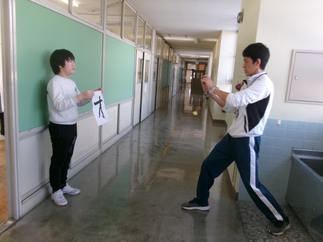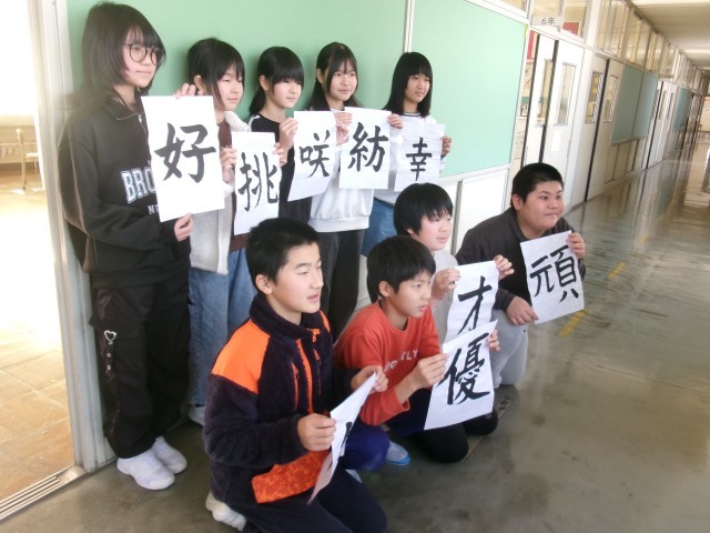 昨日の書写の時間に書いた「未来の自分に贈る一字」の記念撮影をしました。