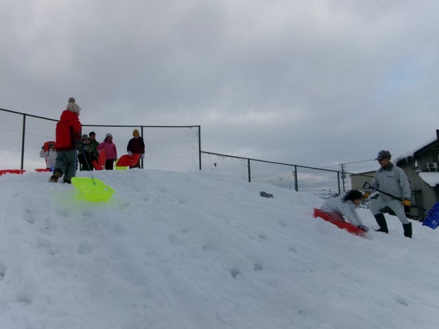 今朝の冷え込みで雪が固くなり、ソリがよく滑りました。
