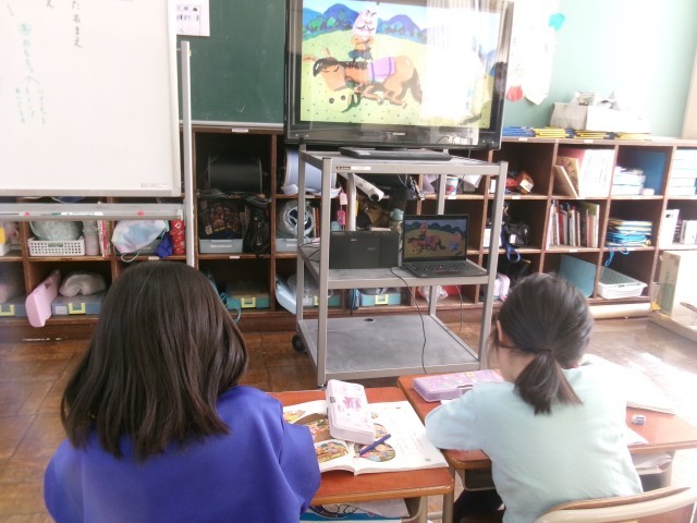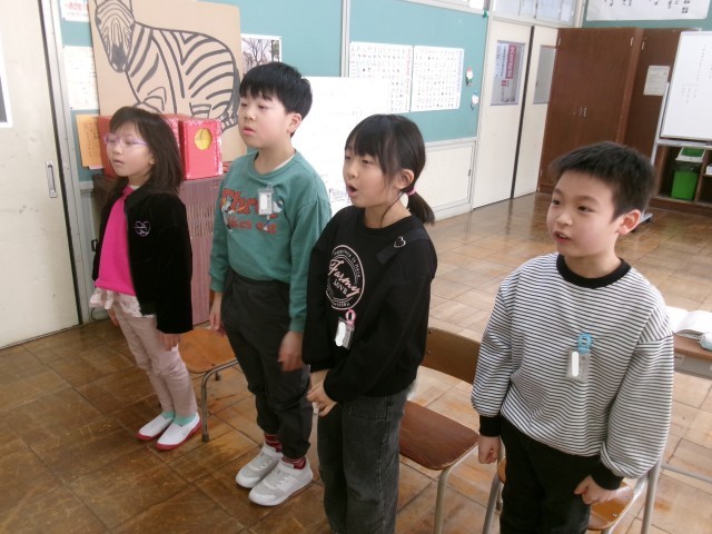 1年生は、わらしべちょうじゃのお話を聞いて、感想をまとめていました。