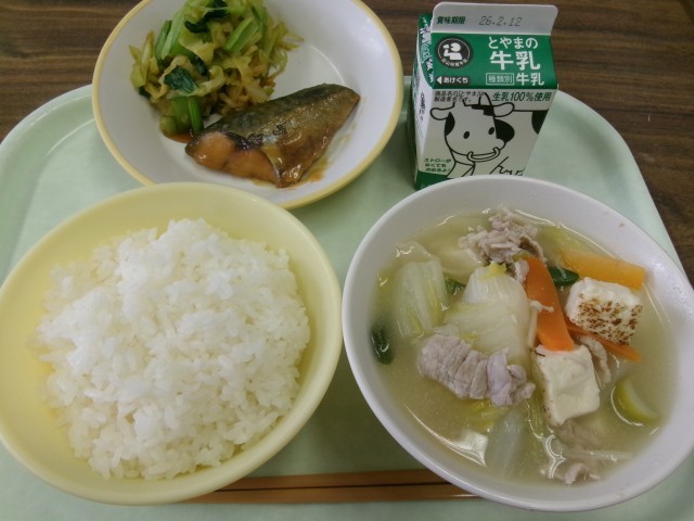 今日の献立は、ごはん、牛乳、さばのみそ煮、おひたし、塩こうじ鍋です。