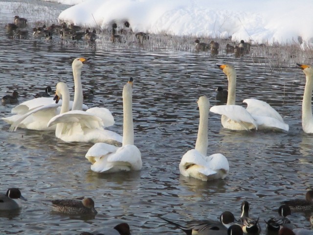 そんな中、白鳥たちは仲間とタイミングをそろえながら首の上げ下げをして、大きな声で鳴いていました。