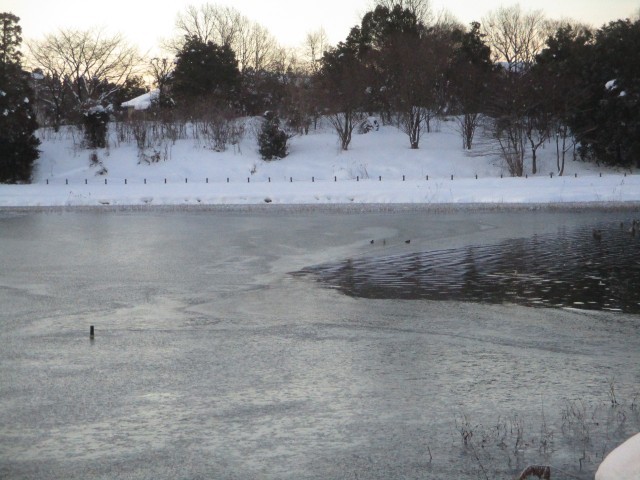 今朝は冷え込みが厳しく、池の北側は凍っていました。