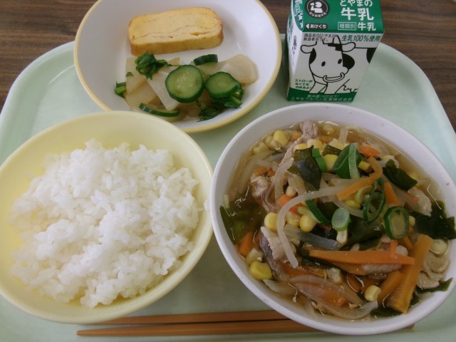 献立は、ごはん、牛乳、厚焼き玉子、かぶのいろどり、サッポロラーメン、大豆ふりかけです。