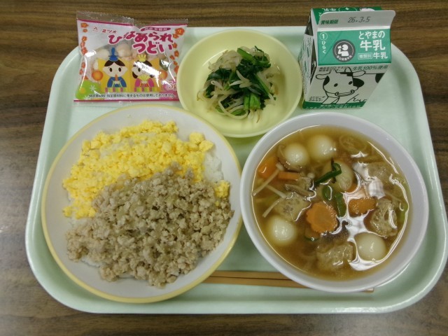 今日はひなまつり献立で、ごはん、牛乳、二色丼(鶏そぼろ・炒り卵)、なばなひたし、白玉汁、ひなあられでした。
